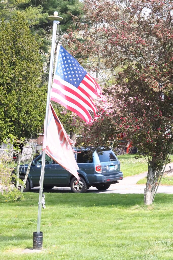 I have had the exact same experience. Most of my bike rides (I am obsessive and ride almost every day, except when it rains or snows), due to where my home is situated, begin with a climb up Fort Hill, reputed to be the steepest climb on Route 1 in the nation. At the top of the hill, just as I begin my descent, there has been a Trump flag under Old Glory since 2016.
